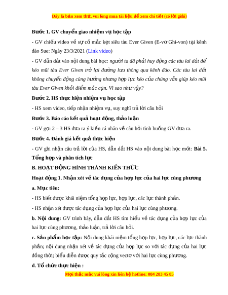 ư thông qua kênh đào. Các tàu lai d t ắ không chuy n ể đ ng ộ cùng hư ng ớ nh ng ư h p ợ l c ự kéo c a ủ chúng v n ẫ giúp kéo mũi tàu Ever Given kh i ỏ đi m ể m c ắ c n. V ạ ì sao nh v ư y? ậ Bư c ớ 2. HS th c ự hi n nhi ệ m ệ v h ụ c ọ t p ậ - HS xem video, ti p nh ế n ậ nhi m ệ v , s ụ uy nghĩ tr l ả i ờ câu h i ỏ Bư c ớ 3. Báo cáo k t ế qu ho ả t ạ đ ng, t ộ h o l ả u n ậ - GV g i ọ 2 – 3 HS đ a r ư a ý ki n cá ế nhân v câu h ề i ỏ tình hu ng G ố V đ a r ư a. Bư c ớ 4. Đánh giá k t ế qu t ả h c hi ự n ệ - GV ghi nh n ậ câu trả l i ờ c a ủ HS, d n ẫ d t ắ HS vào n i ộ dung bài h c ọ m i ớ : Bài 5. T ng h ổ p