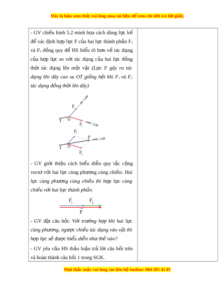 ộ dung: GV trình bày, d n ẫ d t ắ HS tìm hi u ể về tác d ng ụ c a ủ h p ợ l c ự c a ủ hai l c cùng ph ự ư ng, ơ th o l ả u n, ậ tr l ả i ờ câu h i ỏ . c. S n ả ph m ẩ h c ọ t p: ậ N i ộ dung khái ni m ệ t ng ổ h p ợ l c, ự h p ợ l c, ự các l c ự thành phần; n i ộ dung nh n ậ xét về tác d ng ụ c a ủ h p ợ l c ự so v i ớ tác d ng ụ c a ủ hai l c ự đồng th i ờ ; bi u ể di n ễ đư c quy t ợ c ắ c ng vect ộ ơ v i ớ hai l c cùng ph ự ư ng. ơ