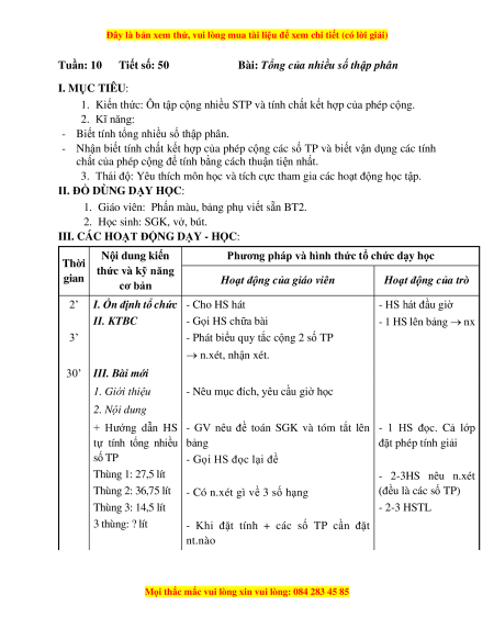 Tuần: 10 Tiết số: 50 Bài: Tổng của nhiều số thập phân