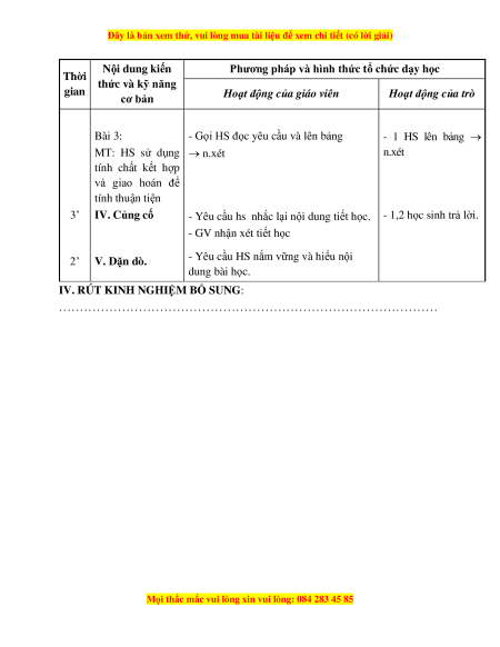 - Gọi HS đọc yêu cầu và lên bảng - 1 HS lên bảng → MT: HS sử dụng → n.xét n.xét tính chất kết hợp và giao hoán để tính thuận tiện 3’ IV. Củng cố