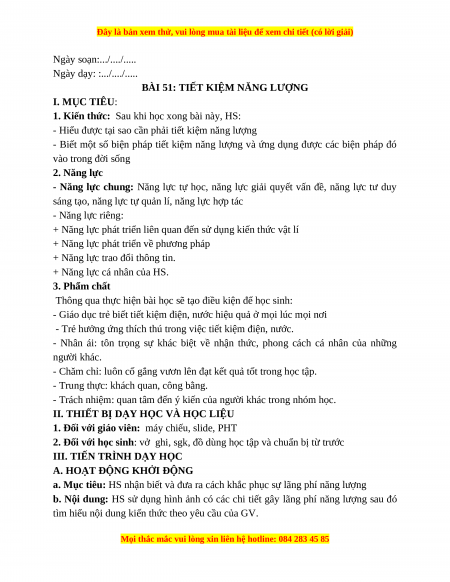 BÀI 51: TIẾT KIỆM NĂNG LƯỢNG I. MỤC TIÊU: