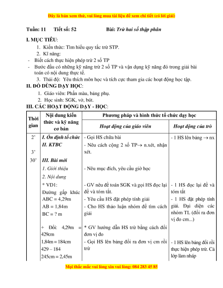 Tuần: 11 Tiết số: 52 Bài: Trừ hai số thập phân