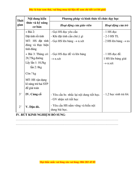 + Bài 3: Thùng có: - Gọi HS đọc đề và lên bảng - 1 HS đọc đề. 28,75kg đường → n.xét 1 HS lên bảng giải Lấy lần 1: 10,5kg → n.xét lần 2: 8kg Còn ? kg MT: HS vận dụng kĩ năng trừ hai STP để giải toán 3’ IV. Củng cố