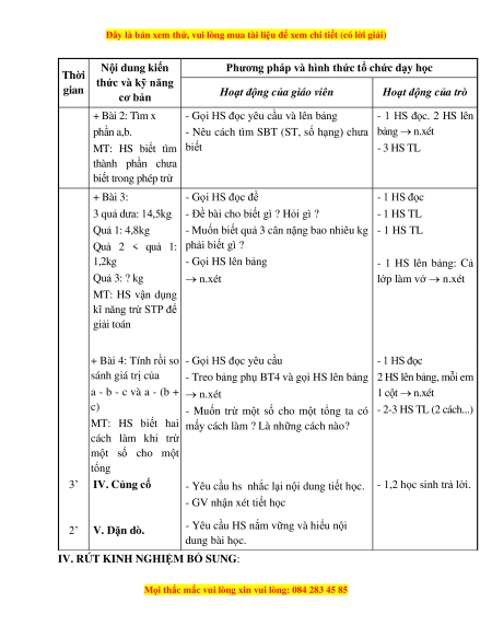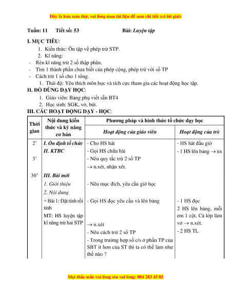 1. Kiến thức: Ôn tập về phép trừ STP. 2. Kĩ năng: