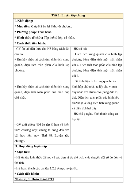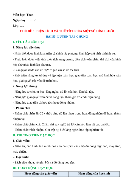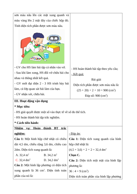 - Thực hiện được việc tính diện tích xung quanh, diện tích toàn phần, thể tích của hình