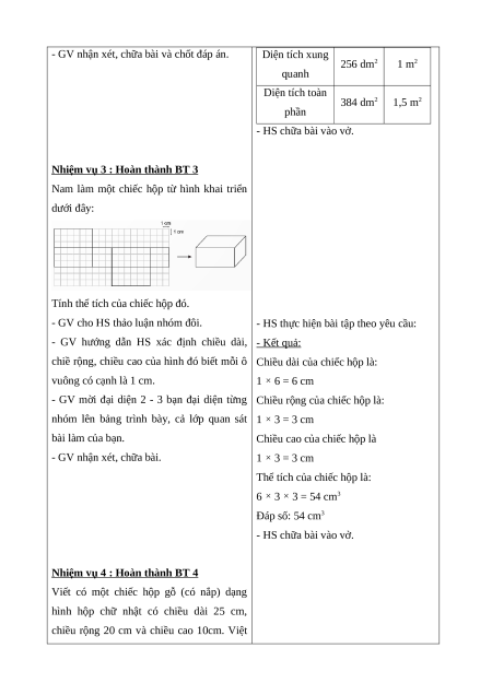 6 × 3 × 3 = 54 cm3 Đáp số: 54 cm3 - HS chữa bài vào vở.