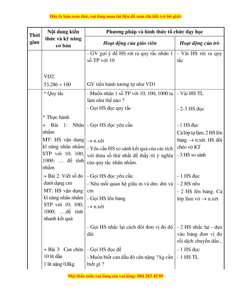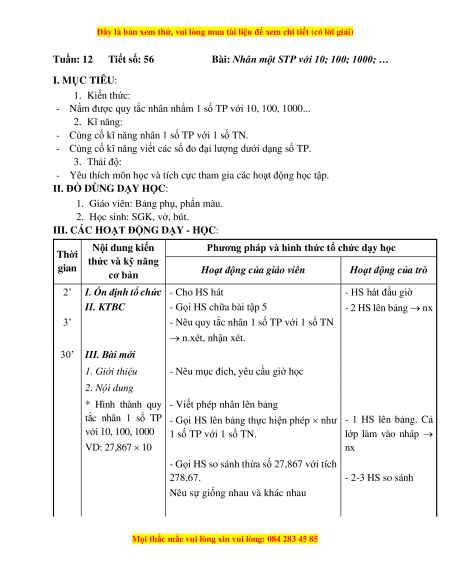 - Nắm được quy tắc nhân nhẩm 1 số TP với 10, 100, 1000... 2. Kĩ năng: