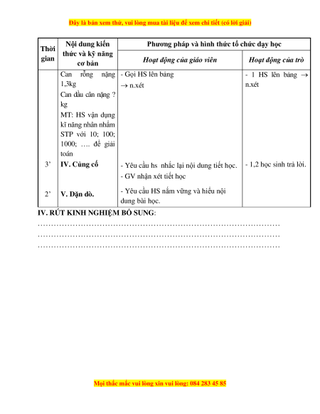 Hoạt động của trò n Can rỗng nặng - Gọi HS lên bảng - 1 HS lên bảng → 1,3kg → n.xét n.xét Can dầu cân nặng ? kg MT: HS vận dụng kĩ năng nhân nhẩm STP với 10; 100; 1000; …. để giải toán 3’ IV. Củng cố