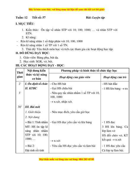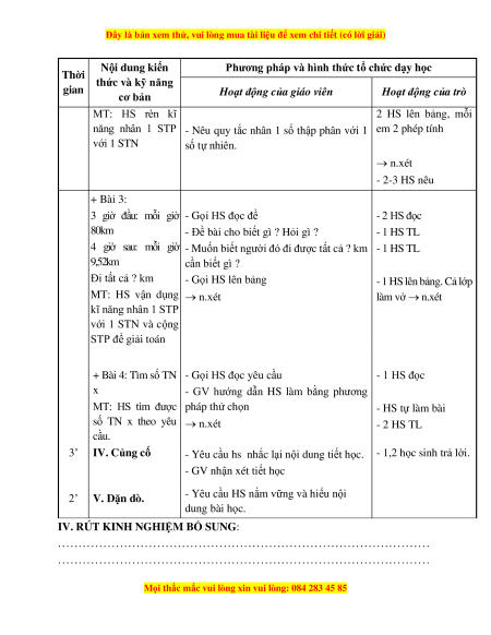 1. Kiến thức: Ôn tập về nhân STP với 10; 100; 1000; … và nhân STP với STN. 2. Kĩ năng:
