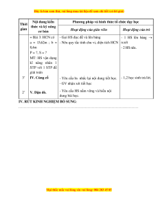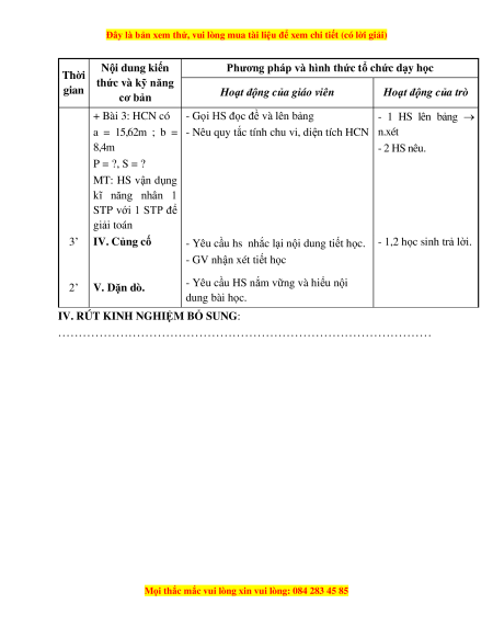 a = 15,62m ; b = - Nêu quy tắc tính chu vi, diện tích HCN n.xét 8,4m - 2 HS nêu. P = ?, S = ? MT: HS vận dụng kĩ năng nhân 1 STP với 1 STP để giải toán 3’ IV. Củng cố