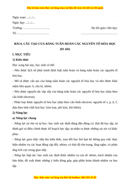 BÀI 6. CẤU TẠO CỦA BẢNG TUẦN HOÀN CÁC NGUYÊN TỐ HÓA HỌC (01 tiết) I. MỤC TIÊU 1) Kiến thức