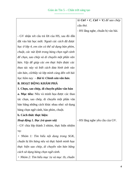 Giáo án Bài 6: Chỉnh sửa văn bản Tin học lớp 5 Chân trời sáng tạo