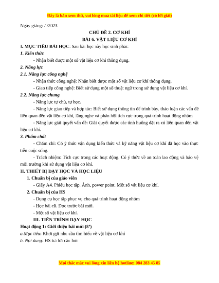 - Năng lực giải quyết vấn đề: Giải quyết được các tình huống đặt ra có liên quan đến vật liệu cơ khí. 3. Phẩm chất