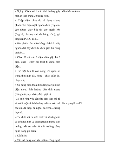 và xử lí một số tình huống mất an toàn mà Hs suy nghĩ trả lời