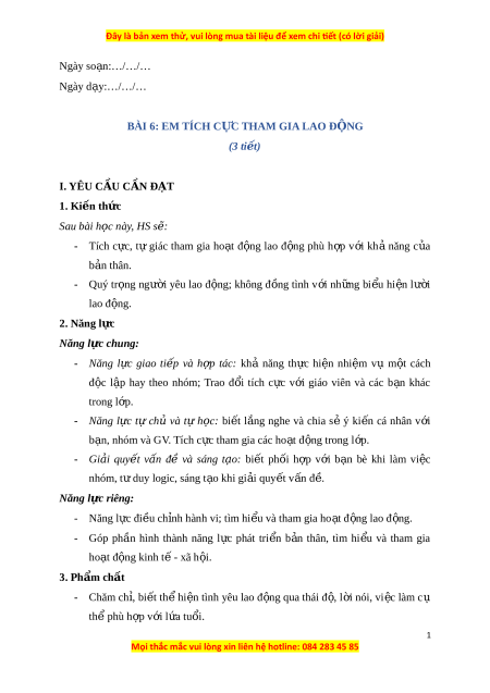 Ngày so n ạ :…/…/… Ngày d y ạ :…/…/… BÀI 6: EM TÍCH C C Ự THAM GIA LAO Đ N Ộ G (3 ti t ế ) I. YÊU C U Ầ C N Ầ Đ T Ạ 1. Ki n ế th c ứ Sau bài h c ọ này, HS s : ẽ - Tích c c ự , tự giác tham gia ho t ạ đ n ộ g lao đ n ộ g phù h p ợ v i ớ kh ả năng c a ủ b n ả thân. - Quý tr n ọ g ng i ườ yêu lao đ n ộ g; không đ n ồ g tình v i ớ nh n ữ g bi u ể hi n ệ l i ườ lao đ n ộ g. 2. Năng l c ự Năng l c ự chung: - Năng l c ự giao ti p ế và h p
