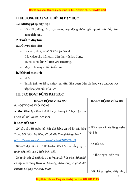 - Các video clip liên quan đ n ế tình yêu lao đ n ộ g. - Tranh, hình n ả h v ề tình yêu lao đ n ộ g. - Máy tính, máy chi u ế (n u ế có). b. Đ i ố v i ớ h c ọ sinh - SHS. - Tranh n ả h, tư li u ệ , video s u ư t m ầ liên quan đ n ế bài h c ọ và d n ụ g c ụ h c ọ t p ậ theo yêu c u ầ c a ủ GV. III. CÁC HO T Ạ Đ N Ộ G D Y Ạ H C Ọ HO T Ạ ĐỘNG C A Ủ GV HOẠT ĐỘNG C A Ủ HS
