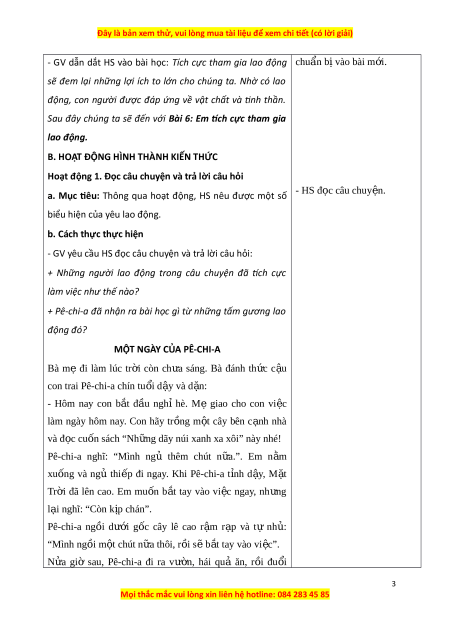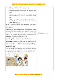 ắ g nghe và chia sẻ ý ki n ế cá nhân v i ớ b n ạ , nhóm và GV. Tích c c ự tham gia các ho t ạ đ n ộ g trong l p ớ . - Gi i ả quy t ế v n ấ đề và sáng t o ạ : bi t ế ph i ố h p ợ v i ớ b n ạ bè khi làm vi c ệ nhóm, t ư duy logic, sáng t o ạ khi gi i ả quy t ế v n ấ đ . ề Năng l c ự riêng: - Năng l c ự đi u ề ch n ỉ h hành vi; tìm hi u ể và tham gia ho t ạ đ n ộ g lao đ n ộ g. - Góp ph n ầ hình thành năng l c ự phát tri n ể b n ả thân, tìm hi u ể và tham gia ho t ạ đ n ộ g kinh t ế - xã h i ộ . 3. Ph m ẩ ch t ấ - Chăm ch , ỉ bi t ế th ể hi n ệ tình yêu lao đ n ộ g qua thái đ , ộ l i ờ nói, vi c ệ làm cụ th ể phù h p ợ v i ớ l a ứ tu i ổ . 1