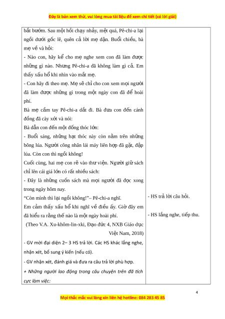 ồ không!”– Pê-chi-a nghĩ. - HS trả l i ờ câu h i ỏ . Em c m ả th y ấ x u ấ hổ khi nghĩ về đi u ề y ấ . Giờ đây em đã hi u ể ra r n ằ g th ế nào là m t ộ ngày hoài phí. - HS l n ắ g nghe, ti p ế thu.