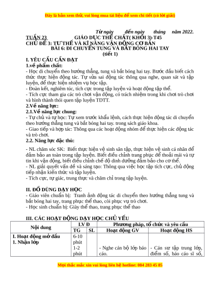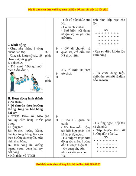 Đây là bản xem th , vu ử i lòng mua tài li u ệ đ xe ể m chi ti t (c ế ó l i ờ gi i ả ) - H i ỏ v s ề c ứ kh e c ỏ a ủ tình hình l p ớ h c ọ cho Hs. Gv. - Cô trò chúc nhau. - Phổ bi n ế n i ộ dung, GV nhi m ệ vụ và yêu c u ầ * * * * * * * * gi h ờ c. ọ * * * * * * * * * * * * * * 2. Kh i ở đ ng ộ * * * * * * * - Ch y ạ nhẹ nhàng 1 vòng 1- - GV di chuy n ể và quanh sân t p. ậ 3-5 2l quan sát, chỉ d n ẫ cho - Cán sự đi u ề khi n ể l p ớ - Xoay các kh p c ớ ổ tay, cổ phút HS th c hi ự n. ệ kh i ở đ ng . ộ chân, vai, hông, gối,... 3. Trò ch i ơ . - Trò ch i ơ “Đ ng, ứ ng i ồ theo hi u l ệ nh”. ệ -Gv tổ ch c ứ Hs ch i ơ 1- trò ch i ơ . - Hs ch i ơ đúng lu t ậ , 1-2 2l nhi t ệ tình sôi n i ổ và đ m ả phút b o an t ả oàn. II. Hoạt đ ng ộ hình thành ki n t ế h c. ứ * Di chuy n ể theo hư ng ớ thẳng, tung và b t ắ bóng hai tay. + TTCB: Đ ng ứ tự nhiên 5-7 1- hai tay c m ầ bóng trư c ớ phút 2l - Cho HS quan sát b ng ụ tranh - Hs l ng ắ nghe, ti p ế thu + Đ ng t ộ ác: - GV làm m u ẫ đ ng ộ và ghi nh . ớ B1: Đi theo hư ng ớ th ng, ẳ tác k t ế h p ợ phân tích - T p ậ luy n ệ theo sự hai tay tung bóng lên cao kĩ thu t ậ đ ng t ộ ác. hư ng d ớ ẫn c a G ủ v. theo hư ng ớ di chuy n, ể m t ắ - Hô nh p ị và th c ự hi n ệ GV nhìn theo bóng. đ ng ộ tác m u, ẫ hư ng ớ * * * * * * * * B2: Khi bóng r i ơ xu ng ố dẫn Hs th c hi ự ện đt. * * * * * * * ngang ng c, ự dung hai tay - Gv quan sát, uốn * * * * * * * b t ắ bóng. n m ắ và s a ử sai cho * * * * * * * + K t ế thúc: v ề TTCB Hs. M i