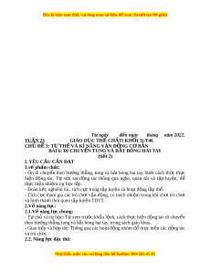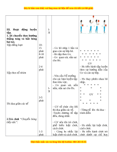 ắ bóng hai tay. trong sách giáo khoa. - Giao ti p ế và h p ợ tác: Thông qua các ho t ạ đ ng ộ nhóm đ t ể h c ự hi n ệ các đ ng ộ tác và trò ch i ơ . 2.2. Năng l c đ ự c t ặ hù: - NL chăm sóc SK: Bi t ế th c ự hi n ệ v ệ sinh sân t p, ậ th c ự hi n ệ v ệ sinh cá nhân để đ m ả b o ả an toàn trong t p ậ luy n. ệ Bi t ế đi u ề ch nh ỉ trang ph c ụ đ ể tho i ả mái và tự tin khi v n ậ đ ng, bi ộ t ế đi u ch ề nh ch ỉ đ ế di ộ nh dư ng ỡ đ m ả b o ả cho c t ơ h . ể - NL gi i ả quy t ế v n ấ dề và sáng t o: ạ Thông qua vi c ệ h c ọ t p ậ tích c c, ự ch ủ đ ng ộ ti p nh ế n ậ ki n t ế h c và t ứ p ậ luy n. ệ - Tích c c, t ự ự giác, trung th c ự và chăm ch t ỉ rong t p ậ luy n. ệ II. Đ D Ồ ÙNG D Y Ạ H C Ọ - Giáo viên chu n ẩ b : ị Tranh nh ả đ ng ộ tác di chuy n ể theo hư ng ớ th ng ẳ tung và b t ắ bóng hai tay, trang ph c ụ th t ể hao, còi ph c v ụ ụ trò ch i ơ . - H c s ọ inh chu n b ẩ :
