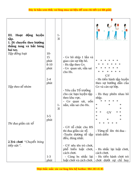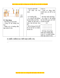 Đây là bản xem th , vu ử i lòng mua tài li u ệ đ xe ể m chi ti t (c ế ó l i ờ gi i ả ) III. Hoạt đ ng ộ luy n ệ 1- tập. 3l 1. Di chuy n ể theo hư ng ớ thẳng tung và b t ắ bóng hai tay. T p đ ậ ồng lo t ạ 10- 15 - Gv hô nh p ị 1 l n ầ và phút giao cán sự l p hô. ớ * * * * * * 8-10 - Hs t p t ậ heo Gv. * * * * * * phút - Gv quan sát, s a ử sai * * * * * * cho Hs. * * * * * * GV 2-4 - Hs ti n ế hành t p ậ luy n ệ phút theo sự hư ng ớ d n ẫ c a ủ T p t ậ heo tổ nhóm Gv và cán sự l p ớ . - Yêu cầu Tổ trư ng ở cho các b n ạ luy n t ệ p ậ - Hs thay phiên nhau hô theo khu v c. ự nhịp. - Gv quan sát, u n ố * * * * * 1- n n, s ắ a ử sai cho Hs. * * * 3l * * * * GV * * 3-5 * * phút * * * Thi đua gi a ữ các t ổ * * * * * - GV tổ ch c ứ cho HS thi đua gi a các ữ tổ. - T ng t ừ ổ lên thi đua - -Tuyên dư ng ơ tổ t p ậ trình di n ễ đ u, đúng nh ề ất. 2.Trò ch i ơ “Chuy n ể bóng ti p s ế c”. ứ - GV nêu tên trò ch i ơ , phổ bi n ế lu t ậ ch i ơ , - Hs nh c ắ l i ạ lu t ậ ch i ơ , cách ch i ơ . cách ch i ơ . 1-3 - Cùng hs nh c ắ l i ạ - Hs ti n ế hành ch i ơ trò phút lu t ậ ch i ơ và cách ch i ơ . ch i ơ dư i ớ sự chỉ huy M i