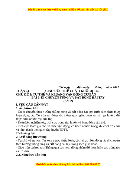 Ủ Ề 3: TƯ THẾ VÀ KĨ NĂNG VẬN Đ N Ộ G C B Ơ N Ả BÀI 6: ĐI CHUY N Ể TUNG VÀ B T Ắ BÓNG HAI TAY (ti t ế 1) I. YÊU CẦU CẦN ĐẠT 1.v ph ề m ẩ chất: - H c ọ di chuy n ể theo hư ng ớ th ng, ẳ tung và b t ắ bóng hai tay. Bư c ớ đ u ầ bi t ế cách th c ứ th c ự hi n ệ đ ng ộ tác. Tự s a ử sai đ ng