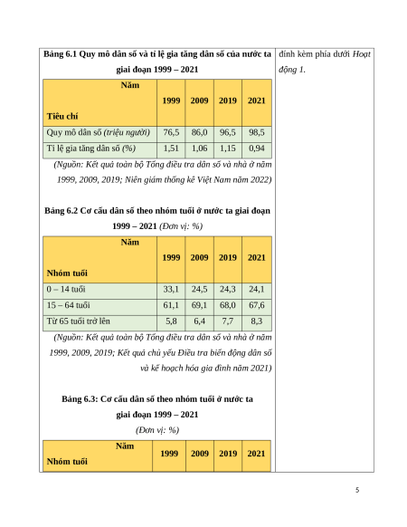 thác Hình 6.1, Bảng 6.1 – 6.3, thông tin mục I.1, 2, 3 SGK của các nhóm về đặc tr.29 – 33. điểm dân số Việt Nam 4