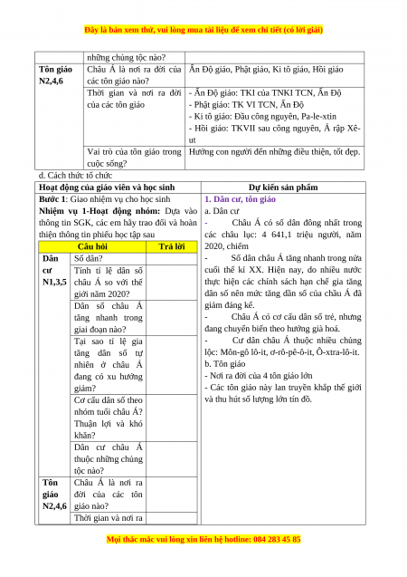 - Dựa vào thông tin và bảng 1 trong mục 1, hãy trình bày đặc điểm dân cư, tôn giáo châu Á. c. Sản Phẩm Câu hỏi Trả lời Dân cư Số dân?