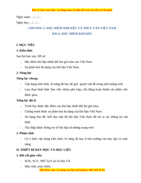 BÀI 6: ĐẶC ĐIỂM KHÍ HẬU I. MỤC TIÊU 1. Kiến thức Sau bài học này, HS sẽ: