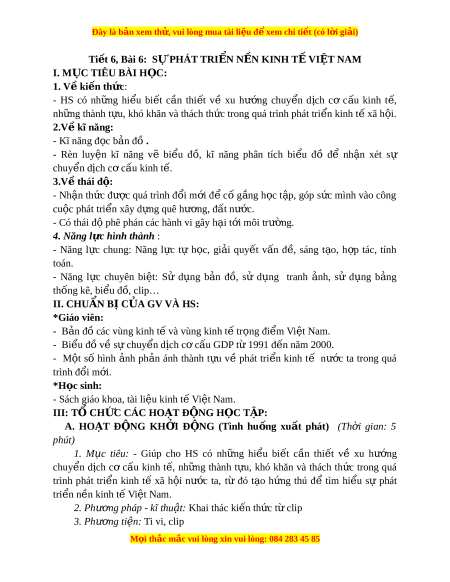 Đây là bản xem th , vu ử i lòng mua tài li u ệ đ xe ể m chi ti t (c ế ó l i ờ gi i ả ) Ti t ế 6, Bài 6: S P Ự HÁT TRI N Ể N N Ề KINH T Ế VI T Ệ NAM I. M C Ụ TIÊU BÀI H C Ọ : 1. V ki ề n t ế h c ứ : - HS có nh ng ữ hi u ể bi t ế c n ầ thi t ế về xu hư ng ớ chuy n ể d ch ị cơ c u ấ kinh t , ế nh ng t ữ hành t u, khó khăn và t ự hách th c t