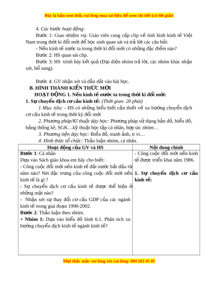 ấ clip về tình hình kinh tế Vi t ệ Nam trong th i ờ kì đ i ổ m i ớ đ h ể c s ọ inh quan sát và tr l ả i ờ các câu h i ỏ : - N n ề kinh t n ế ư c t ớ a trong th i ờ kì đ i ổ m i ớ có nh ng đ ữ c đi ặ m ể nào? Bư c ớ 2: HS quan sát clip. Bư c ớ 3: HS trình bày k t ế qu ả (Đ i ạ di n ệ nhóm tr ả l i ờ , các nhóm khác nh n ậ xét, bổ sung). Bư c ớ 4: GV nh n ậ xét và d n d ẫ t ắ vào bài h c. ọ B. HÌNH THÀNH KI N Ế TH C Ứ M I Ớ HOẠT Đ N Ộ G 1. N n ki ề nh t n ế ư c t ớ a trong th i ờ kì đ i ổ m i ớ : 1. Sự chuy n d ể ch c ị c ơ u ki ấ nh t : ế (Th i ờ gian: 20 phút) 1 M c