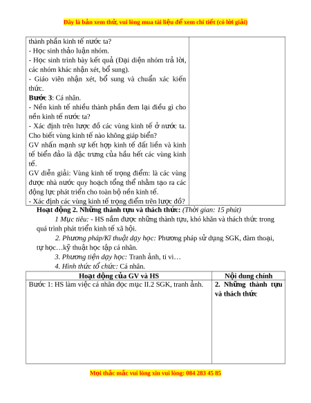 Những thành t u và t ự hách th c ứ : (Th i ờ gian: 15 phút) 1 M c ụ tiêu: - HS n m ắ đư c ợ nh ng ữ thành t u, ự khó khăn và thách th c ứ trong quá trình phát tri n ể kinh tế xã h i ộ . 2. Phư ng ơ pháp/Kĩ thu t ậ d y ạ học: Phư ng ơ pháp sử d ng ụ SGK, đàm tho i ạ , t h ự c…k ọ ỹ thu t ậ h c ọ t p cá nhân. ậ 3. Phư ng t ơ i n d ệ y ạ h c: ọ Tranh nh, ả ti vi… 4. Hình th c t ứ ổ ch c ứ : Cá nhân. Hoạt đ ng c ộ a G ủ V và HS N i ộ dung chính Bư c 1: ớ HS làm vi c cá nhân ệ đ c m ọ c I ụ I.2 SGK, tranh nh. ả 2. Nh ng ữ thành t u ự và thách th c ứ M i ọ thắc m c