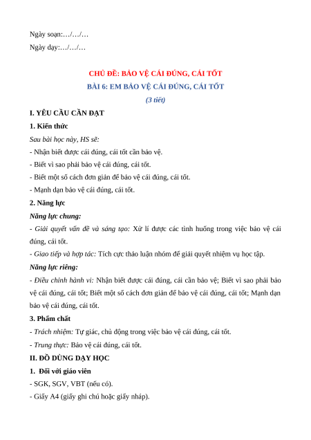 BÀI 6: EM BẢO VỆ CÁI ĐÚNG, CÁI TỐT (3 tiết)