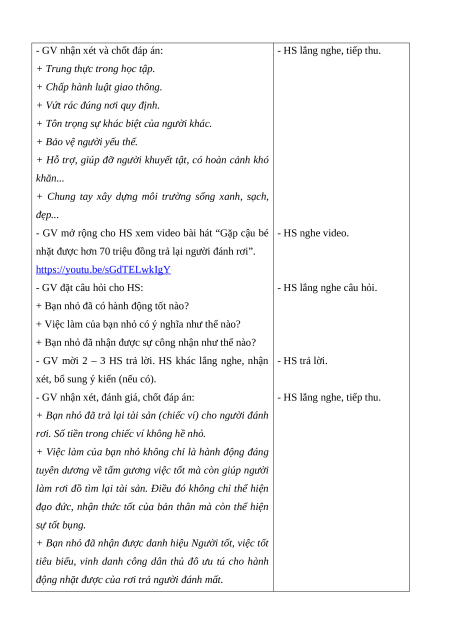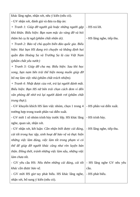 - GV yêu cầu HS: Nêu thêm những cái đúng, cái tốt - HS lắng nghe GV nêu yêu