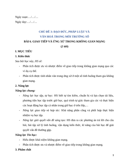 - Phân tích được ưu và nhược điểm về giao tiếp trong không gian mạng. 3. Phẩm chất 1
