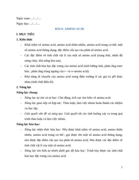 Ngày soạn:…/…/… Ngày dạy:…/…/… BÀI 6: AMINO ACID I. MỤC TIÊU 1. Kiến thức