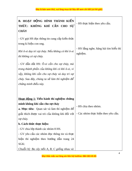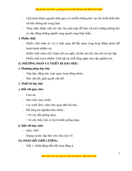 II. PHƯƠNG PHÁP VÀ THI T Ế B Ị D Y Ạ H C Ọ : 1. Phư ng ơ pháp d y ạ h c ọ - Vấn đáp, đ n ộ g não, tr c ự quan, ho t ạ đ n ộ g nhóm. - Nêu v n ấ đ , ề gi i ả quy t ế v n ấ đ . ề 2. Thi t ế b ị d y ạ h c ọ a. Đ i ố v i ớ giáo viên: - Giáo án. - Máy tính, máy chi u ế . - Các tranh n ả h, video liên quan đ n ế bài h c ọ . - Đồ dùng thí nghi m ệ theo nhóm : + 03 cây n n ế gi n ố g nhau. + 02 cốc th y ủ tinh có kích th c ướ gi n ố g nhau. b. Đ i ố v i ớ h c ọ sinh: - SHS, VBT. - D n ụ g c ụ h c ọ t p ậ theo yêu c u ầ c a ủ GV. III. PHÂN B Ố TH I Ờ LƯ N Ợ G: - Ti t ế 1: Kh i ở đ n ộ g đ n ế h t ế ho t ạ đ n ộ g 4 2
