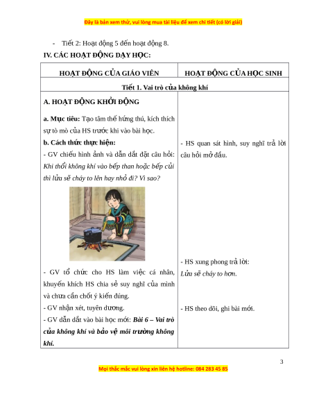 - Ti t ế 2: Ho t ạ đ n ộ g 5 đ n ế ho t ạ đ n ộ g 8. IV. CÁC HO T Ạ Đ N Ộ G D Y Ạ H C Ọ : HOẠT ĐỘNG C A Ủ GIÁO VIÊN HO T Ạ ĐỘNG C A Ủ H C Ọ SINH Tiết 1. Vai trò c a ủ không khí A. HO T Ạ Đ N Ộ G KH I Ở Đ N Ộ G a. M c ụ tiêu: T o ạ tâm th ế h n ứ g thú, kích thích s ự tò mò c a ủ HS tr c ướ khi vào bài h c. ọ b. Cách th c ứ th c ự hi n: ệ