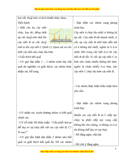 ụ tiêu: Quan sát và làm thí nghi m ệ để gi i ả thích đ c ượ vai trò c a ủ không khí đ i ố v i ớ - Các nhóm th c ự hi n ệ theo yêu c u ầ . s ự cháy. b. Cách th c ứ th c ự hi n: ệ - GV chia l p ớ thành các nhóm 8 HS. - GV yêu c u ầ các nhóm đ c ọ thông tin và th c ự hi n ệ thí nghi m ệ theo h n ướ g d n ẫ trang 24 SGK: Chu n ẩ b : ị Ba cây n n ế A, B, C gi n ố g nhau và 4