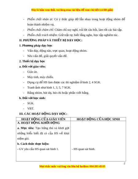 II. PHƯƠNG PHÁP VÀ THI T Ế B Ị D Y Ạ H C Ọ : 1. Phư ng ơ pháp d y ạ h c ọ - Vấn đáp, đ n ộ g não, tr c ự quan, ho t ạ đ n ộ g nhóm. - Nêu v n ấ đ , ề gi i ả quy t ế v n ấ đ . ề 2. Thi t ế b ị d y ạ h c ọ a. Đ i ố v i ớ giáo viên: - Giáo án. - Máy tính, máy chi u ế . - D n ụ g c ụ đ ể HS làm đ c ượ các thí nghi m ệ ở hình 2, 4 SGK. - Tranh n ả h nh ư hình 1, 3, 5, 7 SGK. - B n ả g nhóm, bút d , ạ bút chì ho c ặ ph n ấ vi t ế b n ả g. b. Đ i ố v i ớ h c ọ sinh: - SGK. - VBT. III. CÁC HO T Ạ Đ N Ộ G DẠY H C Ọ : HO T Ạ ĐỘNG C A Ủ GIÁO VIÊN HOẠT ĐỘNG C A Ủ H C Ọ SINH A. HOẠT ĐỘNG KH I Ở Đ N Ộ G a. M c ụ tiêu: T o ạ h n ứ g thú và kh i ơ g i ợ nh n ữ g hi u ể bi t ế đã có c a ủ HS về khái niệm gió. b. Cách th c ứ th c ự hi n: ệ - GV yêu c u ầ HS quan sát hình 1. - HS quan sát hình. 2 M i
