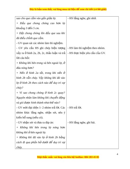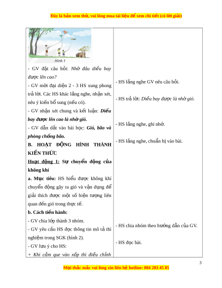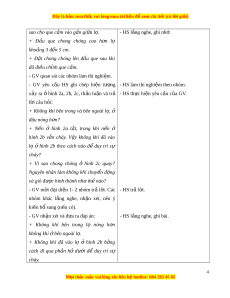 ọ Gió, bão và phòng ch n ố g bão. - HS l n ắ g nghe, chu n ẩ b ịvào bài. B. HO T Ạ Đ N Ộ G HÌNH THÀNH KI N Ế TH C Ứ Ho t ạ đ ng ộ 1: Sự chuy n ể đ ng ộ c a ủ không khí a. M c ụ tiêu: HS hi u ể đ c ượ không khí chuy n ể đ n ộ g gây ra gió và v n ậ d n ụ g để gi i ả thích đ c ượ m t ộ số hi n ệ t n ượ g liên quan đ n ế gió trong th c ự t . ế b. Cách ti n ế hành: - GV chia l p ớ thành 3 nhóm. - HS chia nhóm theo h n ướ g d n ẫ c a ủ GV. - GV yêu c u ầ HS đ c ọ thông tin mô t ả thí nghi m ệ trong SGK (hình 2). - HS đ c ọ bài. - GV l u ư ý cho HS: + Khi c m ắ que vào x p ố thì đi u ề ch n ỉ h 3 M i