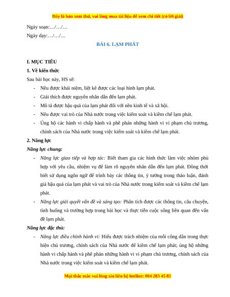 Ngày soạn:…/…/… Ngày dạy:…/…/… BÀI 6. LẠM PHÁT I. MỤC TIÊU 1. Về kiến thức Sau bài học này, HS sẽ: