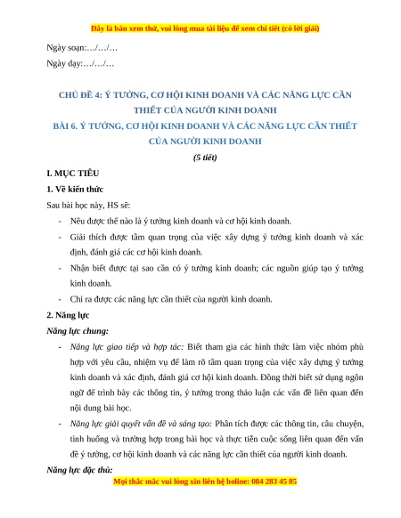 Giáo án Bài 6 KTPL 11 Kết nối tri thức: Ý tưởng, cơ hội kinh doanh và các năng lực cần thiết của người kinh doanh