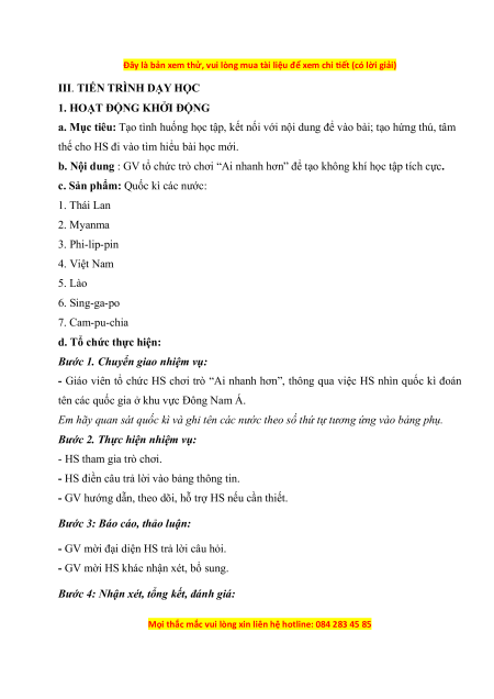 c. Sản phẩm: Quốc kì các nước: 1. Thái Lan 2. Myanma 3. Phi-lip-pin 4. Việt Nam 5. Lào 6. Sing-ga-po 7. Cam-pu-chia d. Tổ chức thực hiện: