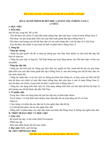 BÀI 6: HÀNH TRÌNH ĐI ĐẾN ĐỘC LẬP DÂN TỘC Ở ĐÔNG NAM Á (3 TIẾT) I. MỤC TIÊU 1. Kiến thức