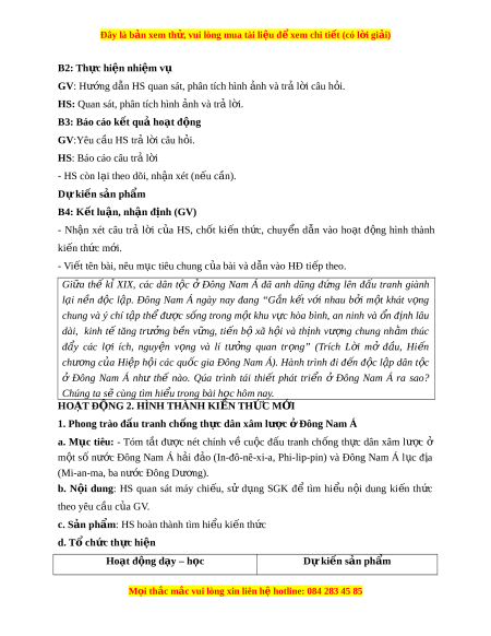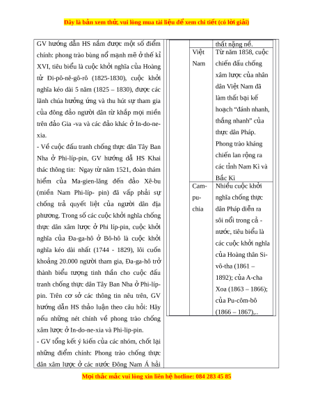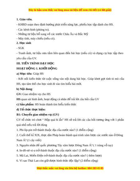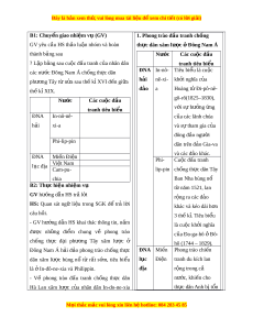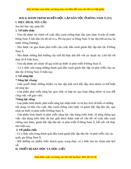 ầ hình thành và phát tri n ể năng l c ự v n ậ d ng ụ ki n ế th c ứ , kỉ năng thông qua việc vận d ng ụ ki n ế th c ứ đã h c ọ gi i ả thích đư c ợ m t ộ số v n ấ đề về cu c ộ đ u ấ tranh chống xâm lư c ợ , giành đ c ộ l p ậ dân t c ộ và phát tri n ể ở Đông Nam Á, k t ế n i ố v i ớ th c ự tiên hi n ệ nay. 3. Về ph m ẩ ch t ấ - Có ý th c ứ trên trong thành qu ả đ u ấ tranh giành đ c ộ l p ậ dân t c ộ và phát tri n ể c a ủ các qu c ố gia Đông Nam Á. - B i ồ dư ng ỡ các ph m ẩ ch t: ấ khách quan, trung th c ự , có ý th c ứ tìm tòi, khám phá l c ị h s . ử II. THI T Ế B Ị D Y Ạ H C Ọ VÀ H C Ọ LI U Ệ M i