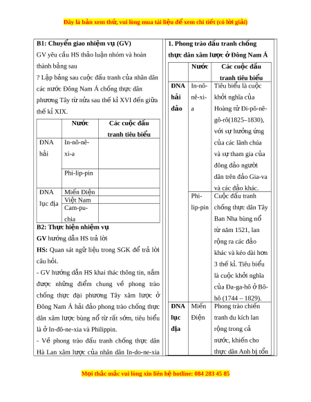 ả (In-đô-nê-xi-a, Phi-lip-pin) và Đông Nam Á l c ụ đ a ị (Mi-an-ma, ba nư c ớ Đông Dư ng) ơ . - Nêu đư c ợ các giai đo n ạ phát tri n ể c a ủ cu c ộ đ u ấ tranh giành đ c ộ l p ậ dân t c ộ ở Đông Nam Á. - Nêu đư c ợ nh ng ữ nh ả hư ng ở c a ủ chế độ th c ự dân đ i ố v i ớ các thu c ộ da. Liên h ệ v i ớ thực t ế ở Việt Nam. - Tóm tắt đư c ợ nét chính v ề qua trình tái thi t ế và phát tri n ể ở Đông Nam Á. - Có ý th c ứ trân tr ng ọ nh ng ữ thành quả đ u ấ tranh giành đ c ộ l p ậ và phát tri n ể c a ủ các dân t c ộ ở Đông Nam Á hi n ệ nay. 2. Về năng lực * Năng lực chung: - Giải quy t ế đư c ợ nh ng ữ nhi m ệ vụ h c ọ t p ậ m t ộ cách đ c ộ l p, ậ theo nhóm và th ể hi n ệ sự sáng t o. ạ - Góp ph n ầ phát tri n ể năng l c ự giao ti p ế và h p ợ tác qua ho t ạ đ ng ộ nhóm và trao đ i ổ công vi c ệ v i ớ giáo viên. *Năng l c ự riêng: - Góp ph n ầ hình thành, phát tri n ể năng l c ự nh n ậ th c ứ và t ư duy l c ị h s ử hi u ể rõ nh ng ữ n i ộ dung cơ b n ả c a ủ cu c ộ đ u ấ tranh ch ng ố xâm lư c ợ và giành đ c ộ l p ậ dân t c ộ , quá trình tái thi t ế và phát tri n ể ở Đông Nam Á. - Góp ph n