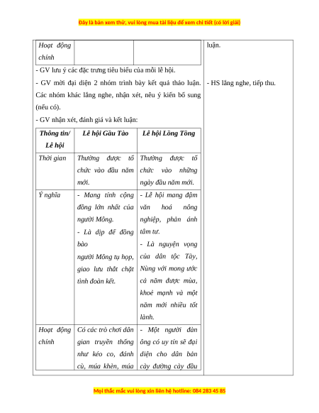 - GV hướng dẫn HS lập bảng so sánh các nội dung chính của hai lễ hội: Thông tin/