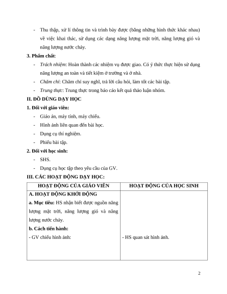 - Việc khai thác, sử dụng các dạng năng lượng mặt trời, năng lượng gió và năng lượng nước chảy. 2. Năng lực: