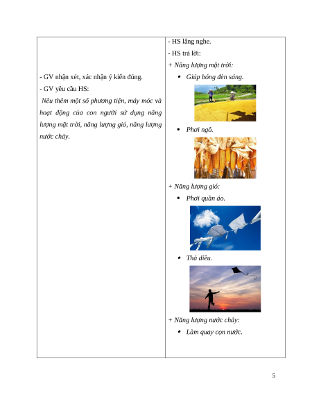 Giáo án Bài 6: Năng lượng mặt trời, năng lượng gió và năng lượng nước chảy Khoa học lớp 5 Cánh diều